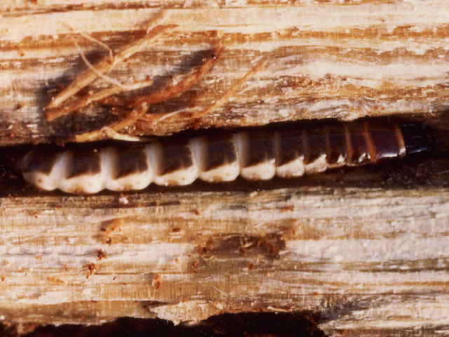 カミキリ坑道内のウバタマコメツキ幼虫