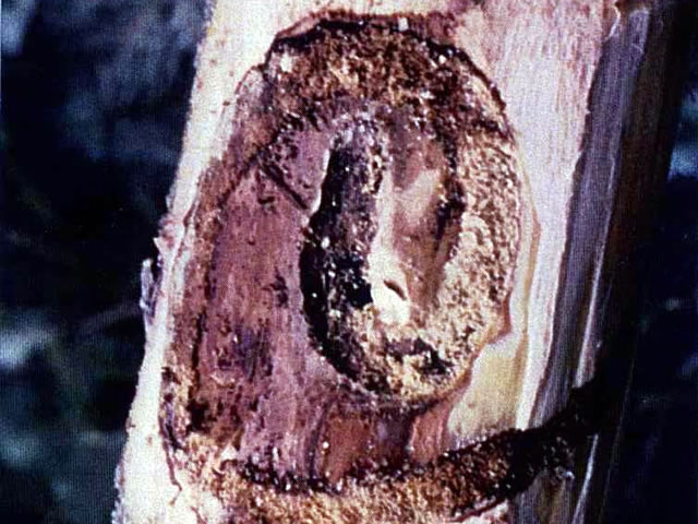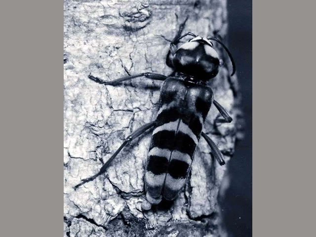 説明 成虫の体長25mm前後で、トラカミキリの中では最大。前胸背は側方に大きく張り出す特異な形態をしており、黒色で背面に黄褐色の横帯を持つ。一般的には数の少ないカミキリであるが、トドマツ、モミ、エゾマツの生立木を加害し、北海道のトドマツ造林地では本種による大量の枯死木が出た記録がある。幼虫の食痕は一部が渦巻き状になるなど独特。1世代に2年を要する。 |