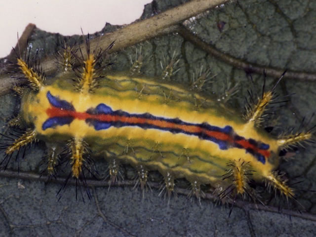 説明 成虫の開張23-30mm。前翅は淡緑色で基部と外縁に茶褐色の模様。老熟幼虫は体長18mm程度。体表に円錐状の突起が多数ある。これには毒棘が生えており、ふれると激しい痛みをもたらす。幼虫はクヌギ、サクラ、ウメ、クリ、ケヤキなどを食害する。年2化で成虫は5~6月、8~9月に出現する。若齢幼虫は群れて用面全体をなめるように食害するが、成長に伴い分散し、葉縁から食べる。 |