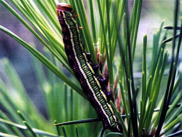 成虫の開張60~80mm。前翅は暗灰色で、濃褐色の短い縦条があり、後翅は濃褐色。腹部背面に茶褐色の縦線。老熟幼虫は体長約65mm。緑色の体色で、背面と側面に白と褐色の縦線を持つ。アカマツ、クロマツ、エゾマツなどの針葉を食害する。年2化で成虫は5~6月、7~8月に発生。卵は針葉に1個ずつ産卵される。老熟した幼虫は落下して土中や落葉内で蛹化する。