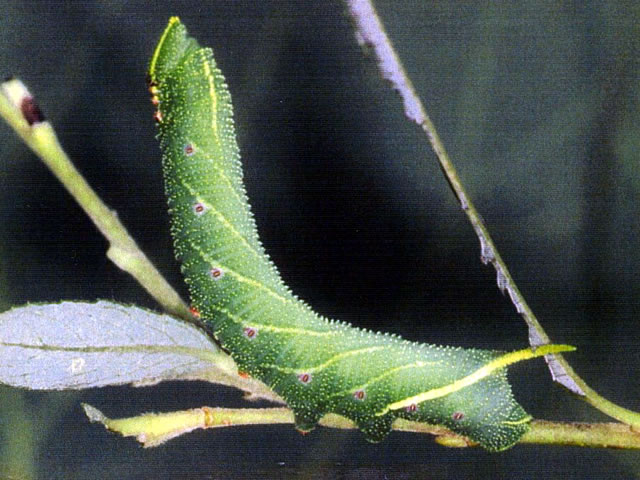 成虫の開張70~100mm。幼虫は体長70~80mmで、頭部は縦長の三角形で前面側方がやや角張る。幼虫は全体が緑色で、頭部側方縦線、胸部には上方に側線、また胸部に目立つ黄白色の7斜線がある。気門の周囲は暗紫色。成虫は5~9月に発生し、越冬態は蛹。幼虫はヤナギ類、ポプラ、サクラ、リンゴ、ウメなどの葉を食害する。