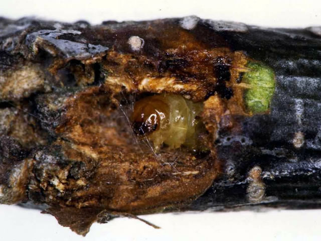 イヌエンジュ小枝内のエンジュヒメハマキ老熟幼虫