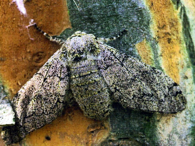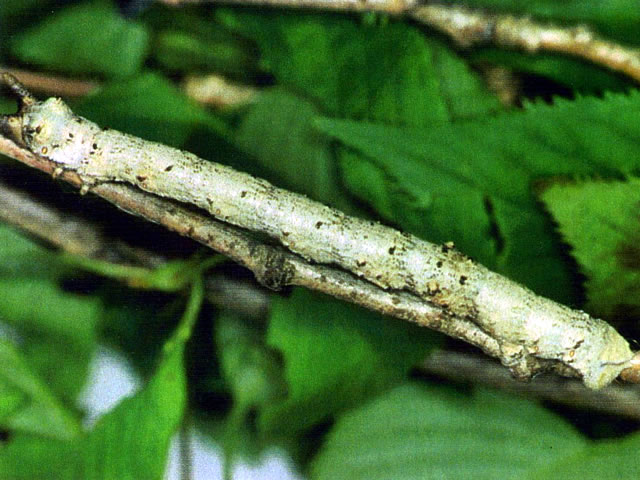 説明 成虫の開張50-70mm。雌成虫は灰色、雄は茶褐色。幼虫は暗褐色の大きな尺取り虫で75〜90mm、頭部が角状に突き出る。サクラ、リンゴ、ミズキ、クヌギ、ツバキ、チャなどの葉を食害する。ときどき伊豆七島で大発生し、ツバキの葉を食い荒らし、大きな被害を与える。年1化で関東では成虫は3〜4月に発生し、樹皮などに卵塊を生む。 |