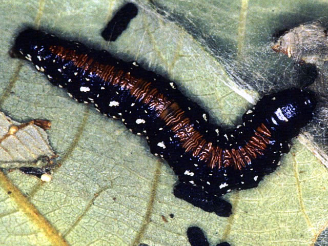 成虫は開張33~51mm、翅は淡褐色で黒褐色班と波状の黄色班。幼虫は体長35~40mmで、胴部に顕著な橙色と黒褐色の帯が走る。年1化。成虫は6月に羽化。幼虫は7~8月に集団で葉を食べ、9月に老熟後、地中で越冬する。ヌルデ、ニワウルシ、クルミなどの葉をつづって食害する。