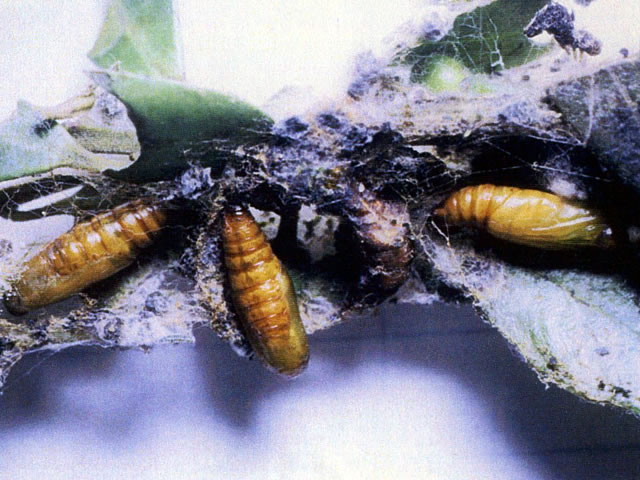 説明 成虫の開張23~26mm。幼虫は体長約25mm、後胸から第一腹節にかけて顕著に太く、前方にいくに従って狭まる。胴部は灰褐色の地に、黒褐色の班をまとう。成虫の出現は4月と6~8月の2回。1回目の幼虫は6~7月に成熟し、また2回目の幼虫は9月下旬以降に蛹化して越冬する。イヌツゲを食害する。 |