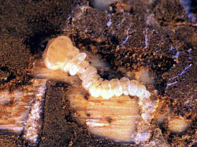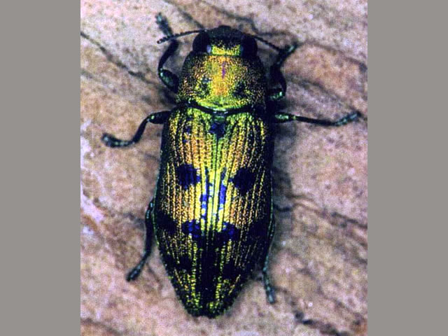説明 成虫は体長7~13mm、鞘翅は金色~赤橙色で緑色の金属光沢があり美麗。年1回発生。材内で幼虫越冬し、4月ころ蛹化する。成虫は4~6月に脱出し、ヒノキの葉や枝を摂食後、ヒノキやスギの粗皮割れ目に産卵する。強度の助間伐や枝打ちを受けたり、林道開設された林縁部など、生理障害で衰弱したと思われるスギ、ヒノキ林でしばしば発生する。また伐倒木に葉を付けたままで乾燥させる「葉枯らし材」も本種の標的となる。 |