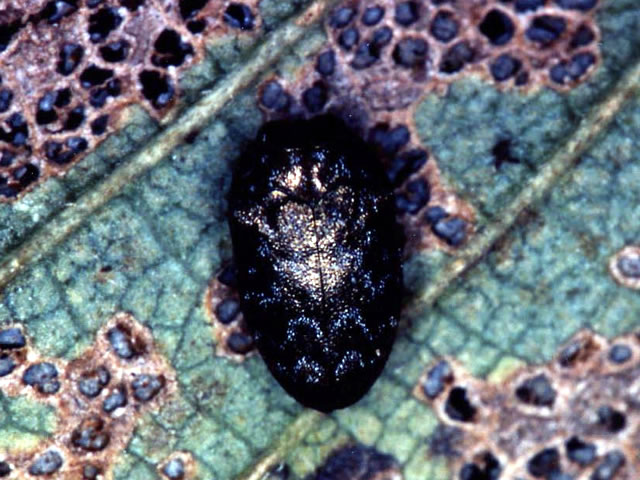 説明 成虫の体長2.6~4.2mmで、卵形。上肢は褐色の毛で覆われ、3本の波形で銀白色の横帯がある。年1化で、成虫は粗皮などで集団越冬後、おもにケヤキの若葉を摂食する。産卵は葉になされ、孵化幼虫は葉の内部に侵入して葉肉を食害する。大発生時には多くの葉で食害痕が茶褐色になり、落葉する。蛹化は葉の食害痕の中で行われ、羽化した成虫は再び葉を食害する。 |