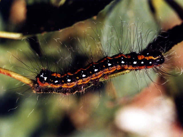 説明 成虫は開張45~50mm、前翅は灰白色で黒い剣状紋がある。幼虫は体長約45mm、胴部は黒色で背面と側面に橙黄色の帯が前後に走る。体全体に長毛がある。本州以西での発生は年2回。1回目の成虫は5月頃、2回目は7月頃発生する。越冬は樹皮の割れ目などに作られた繭ないでなされる。幼虫はサクラ、リンゴ、ナシ、ヤナギなどの樹木の葉を食害する。 |