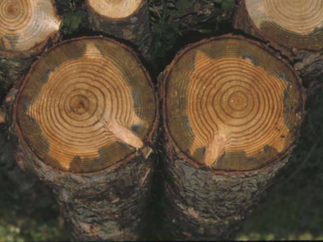 説明 病原菌は、 表記以外にOphiostoma piceae (Munch) H. etP. Sydow 他がある。生立木あるいは伐倒木の付傷部あるいは穿孔虫類の加害部分から病原菌が侵入し、辺材部が青く変色する。病原菌はCeratocystiopsis属の菌もあり、これらは子のう菌類のオフィオストマ様菌類と呼ばれ、一般に子のうが形成される子のう殻の頚部が長く、複数の分生子世代を有し、酵母状になるものもあり、キクイムシ類と密接な関係をもっている。分生子世代以外に形成しにくい菌もあり、同定が難しい種も多く、今後の調査が待たれる。菌の種によっては病原性がかなり強いものも存在し、萎凋性の症状を起こす。 |