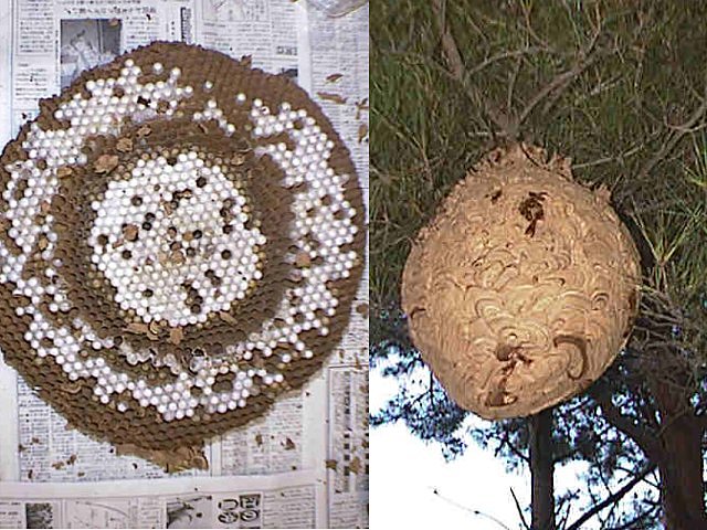 説明 女王の体長25~28mm。働きバチの体長18-24mm。日本で最も普通なスズメバチ類のひとつ。近年都市部での営巣が注目されるが、本来は里山や疎林、林縁部などに生息。日本産スズメバチ属で最大の営巣規模を誇る。成熟巣の平均育室数は北海道で平均約2000、本州西南部で約6000。攻撃性はかなり強い。閉鎖空間(巣箱、壁の間など)になされることが多いが、巣が収まりきらなくなると近くの広い空間(軒先、樹枝など)に引っ越して新しい巣を作ることが多い。こうした開放空間で見つかる巣は、ほとんどが7月末以降に新設された引越巣である。引越はミツバチの分封とは異なり、女王を含むすべての個体が新しい巣に移動し、旧巣は空になる。