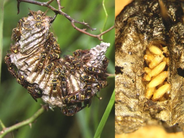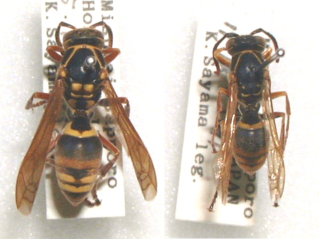説明 体長は約11~17mm。体色は黒色で赤褐色と黄色の斑紋がある。和名の通り日本産のアシナガバチ属(Polistes)の中では最も小型の種であるが、攻撃性はやや強い。近似種のキボシアシナガバチとは腹部第3、4節に黄紋があることで区別できる。また、キボシアシナガバチでは繭のふたが鮮やかな黄色であるのに対して、本種の繭のふたは白色である。巣は巣柄を基点として一方向に伸長し、大型巣では大きく上向きに反り返る。日当たりの良い岩場や樹木の細枝、人家の軒や板壁に営巣する。営巣開始は5月頃。最初の働きバチは7月ころ出現し、8~9月にオスや新女王が出現する。ただし最初の働きバチに混じってオスが出ることもあり、これが他巣の働きバチと交尾することもあるらしい。幼虫の餌として主に鱗翅類の幼虫を狩る。巣の規模はかなり大きく、本州での最大記録は約500育室。最盛期の働きバチ数は、本州以南では約50匹であるが、北海道では約20匹にとどまる。 |