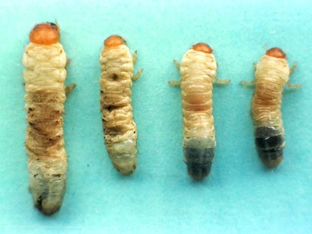 説明 コガネムシ類の幼虫に寄生する。リケッチアはグラム陰性の微小な細菌で、生きた細胞内に寄生し人工培地では培養できない。いくつかの昆虫寄生性のリケッチアを統合してRickettsiella popilliaeという学名が与えられているが、その妥当性については論議がある。日本ではオオスジコガネから発見されたリケッチアがドウガネブイブイ、ヒメコガネなど他のコガネムシ類幼虫にも病原性があることがわかっている。罹病虫はポックスウイルス感染虫と類似し、生存中から体色が白化する。感染したコガネムシ幼虫の血液中には菱形の蛋白結晶が形成される。寄主の大発生時には流行が起こり、天敵微生物としての役割は重要と考えられるが、ほ乳類にも感染性を持つこと、増殖が困難なこと、死亡までの時間が長いことなどから、害虫防除には利用されていない。 |