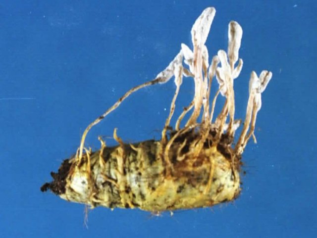 説明 硬化病菌類の一種。鱗翅目、鞘翅目など各種昆虫に寄生する比較的普通種。罹病虫は白ないし黄色の菌糸におおわれ、しばしば分生子柄束を伸ばす。ハナサナギタケに似るが、分生子柄束はほとんど分岐しない。分生子は純白、短い紡錘形からレモン形、2–3×1–1.8μm、コロニー裏面は淡黄色から鮮黄色。かつて本菌はIsaria farinosa, Paeciomyces farinosusと呼ばれていた。ただし、日本の古い教科書では、黄きょう病菌の学名としてIsaria farinosaを使用しているが、黄きょう病菌という名称はほとんどの場合現在のBeauveria bassianaを指しているので注意を要する。 |