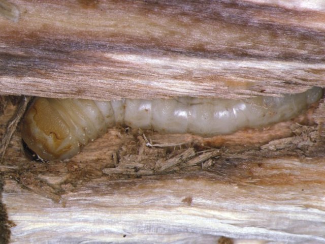 説明 幼虫が、柑橘園の蜜柑類、ポプラ類、ヤナギ類、ハンノキ類、カエデ類、シラカバなどの庭園樹や街路樹のほか、スギ造林木へ穿孔し、被害を与える。成虫の体長は24~35mm。雄は雌に比べて体長に対する触角の長さが長い。老熟幼虫の体長は、45~60mm。1年あるいは2年に1回発生。成虫は、関東地方では6月下旬から7月上旬にかけて脱出する。雌雄成虫とも加害樹の枝の樹皮を摂食して性成熟する。雌成虫は樹幹表面に付けた噛み傷(産卵痕)に産卵管を差し込み産卵する。幼虫は樹皮下および材内を食害する。このため、木の枯損や折損がおこる。幼虫で越冬後、翌年あるいは翌々年に成虫となる。防除法として成虫に対する薬剤散布、産卵防止のための樹幹下部へのトタン巻きなどがある。 |