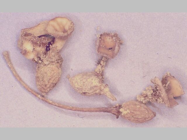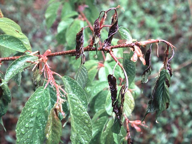説明 春先、サクラの開花時期に地中の菌核から子のう盤を形成し、子のう胞子を飛散する(一次感染)。感染すると幼果が褐色の萎れたミイラ状になり、その表面に白い分生胞子を形成する。この分生胞子も感染源となる(二次感染)。感染した葉は褐斑を生じ、葉の裏の中肋上に白粉状の分生胞子を形成し、二次感染を繰り返す。葉はやがて全体が褐変して枝から垂れ下がり、落下する(写真1)。夏には感染は終息する。感染した幼果は菌核となり、地中で越冬し、翌春子のう盤を生じる(写真2)。菌核は低温を経験させる(春化処理)と、子のう盤を形成する性質がある。感染を毎年繰り返すと、樹体が衰弱して枯死に至る場合もある。 |
