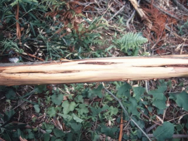 説明 スギでは苗木から成木に、ヒノキでは主に幼齢木に発生する。またカラマツにも発生が知られている。病原菌は東北地方以南に広く分布するが、被害は西南暖地とくに九州、四国に多い。病原は糸状菌の一種で子のう菌類に属する。外観健全な部分にも生息していることが多い菌である。枝付け根を中心に紡錘形の胴枯病斑を形成し、枝枯症状、樹幹の陥没や材の変色を引き起こす。また、黒心材の原因の一つでもある。干害と相まって集団的な枯損被害を引き起こす。寒風害、干害にともなって発生することから、こうした気象害の発生しやすい場所を避けることが望ましい。(不完全世代Macrophoma sugi Hara) |