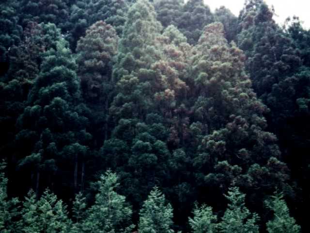 説明 春先に旧葉が枯死するため、症状の激しい場合には新葉が展開する前には全山が枯れたように赤褐色となる。新葉の展開ととも各枝の樹冠の上層は鮮緑色、下層は赤褐色にみえ、症状は目立たなくなる。病原は糸状菌の一種で子のう菌類に属する。不完全世代は見つかっていない。病針葉上に列状に突き出た小黒粒内に子のう殻を生じる。土壌条件によって常襲的に発生する造林地が認められる。こうした林分の激害木では樹勢の低下が著しく、ごくまれに枯死することもある。気象条件によって広範囲に発生することがある。一般に成長の低下する樹齢に発生することが多い。材の変色腐朽を引き起こすことはない。 |