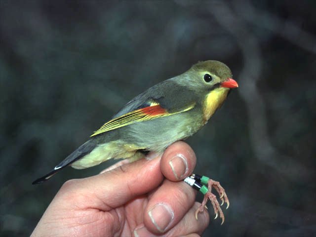 説明 鮮やかな赤い嘴と大きな目、翼には赤や黄色、黒の模様を持つ美しい鳥で、日本には古くから飼い鳥として輸入されていた。ところが1980年前後から飼育下から逸出したと思われる繁殖個体群が九州、近畿、関東という互いに離れた3地域で相次いで発見され、以来個体数を増やすとともに、分布域も広げてきた。関東では茨城県筑波山や神奈川県丹沢などでの生息が知られているが、特に筑波山の山頂付近では最も数の多い繁殖鳥になっており、鳥類をはじめとする在来生物群集に与える影響が懸念されている。鳥獣生態研究室では筑波山のソウシチョウ個体群の動態をモニタリングするとともに、この鳥が他種との競争や餌の利用、種子散布などを通じて在来の生態系に与える影響についての研究を行っている。 |